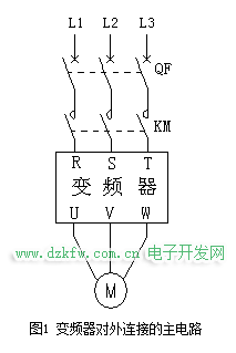 变频器的外接主电路如图1所示。三相交流电源经断路器QF、交流接触器KM与变频器的电源输入端R、S、T连接;变频器的输出端U、V、W则与电动机直接相连,这时电动机的保护由变频器完成。这里的断路器作用有二:一是变频器停用或维修时,可通过断路器切断与电源之间的连接;二是断路器具有短路和欠电压等保护功能,可对变频器起一定的保护作用。而接触器可通过按钮开关方便地控制变频器的通电与断电,同时,当变频器或相关控制电路发生故障时可自动切断变频器的电源。
