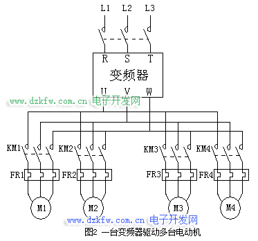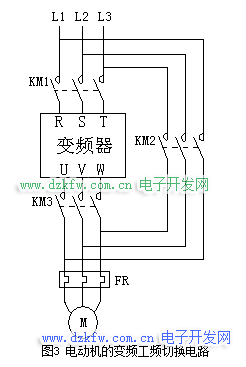 变频器输出端与电动机之间是否需要配置交流接触器,这要根据具体的应用环境来确定。一般情况下,一台变频器控制一台电动机,且不要求与工频进行切换时,变频器与电动机之间无须使用接触器,如图1所示。而一台变频器驱动多台电动机时,则每台电动机必须有单独控制的接触器,并选配合适的热继电器FR对电动机进行保护,具体电路见图2。有时虽然一台变频器仅驱动一台电动机,但有可能在变频与工频之间切换运行,这时也应如图3所示在变频器与电动机之间配置接触器KM3和热继电器FR。电动机在变频运行时,接触器KM2触点断开,接触器KM1和KM3触点闭合,这时变频器对电动机变频驱动并进行全方位的保护。电动机在工频运行时,接触器KM1和KM3触点断开,KM2触点闭合,这时热继电器FR可对电动机进行过载保护。
