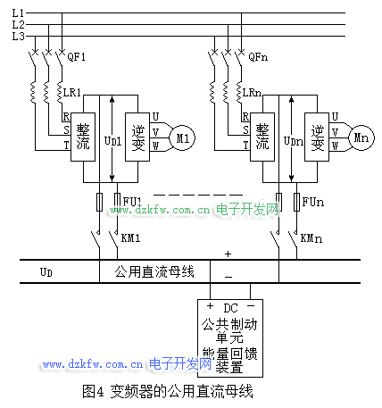 图4是应用比较广泛的共用直流母线方案,该方案包括以下几个部分。