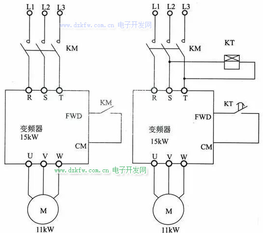 故障处理:按图1B进行改进,增加一只时间继电器KT,用其延时闭合的常开触点,替代图1A中KM的辅助常开触点。这样主回路提前得到电源电压,延时2-3s以后,FWD端子才得到启动信号,保证了变频器的可靠启动。