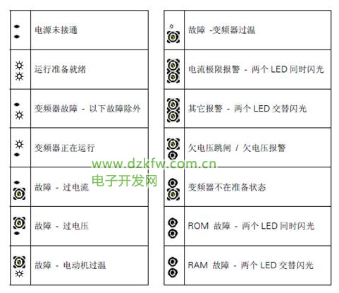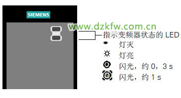 西门子变频器的上,下两个ALM指示灯有四种状态,分别是灯灭,长亮,快速闪烁,和闪烁,分别代下以下含义: