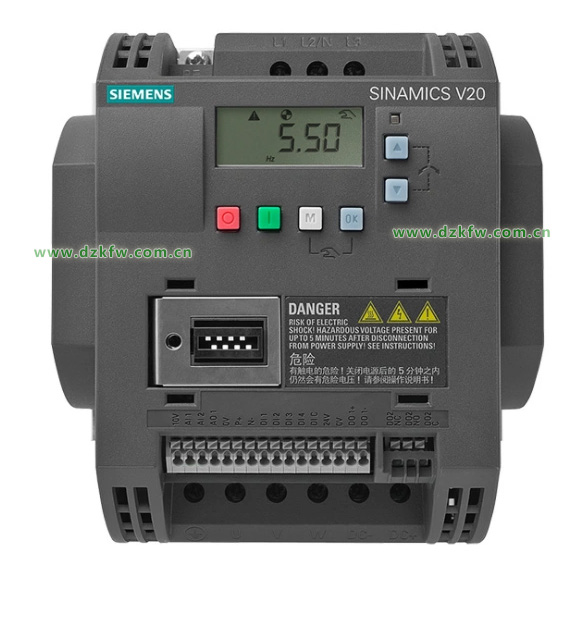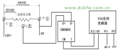 0+,0-为模拟量输入接口,1M, 1为模拟量输出接口,DI1为V20数字输入端子,连接PLC的输出点Q0.0用于控制变频器启停,DIC为数字输入的公共端,图中连接24V电源的负极。
