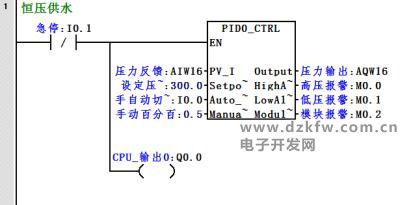 前面讲过PLC控制变频器应用模式之一:端子运行指令通道+端子模拟量通道。该模式典型的应用就是在恒压供水中,利用远传压力表检测检测管道压力,转换成0-10V电压或4-20MA电流模拟量反馈到PLC中,经过PLC进行PID运算,再将运算结果变成模拟量输出,通过变频器的端子模拟量输入通道控制变频器频率从而调节水泵转速,这样形成闭环调节实现恒压供水控制,如下图: