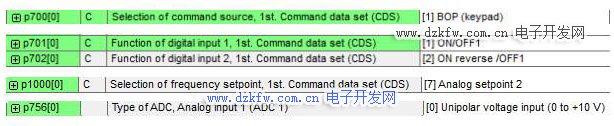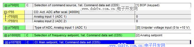 当然也可以通过将P1000(0)=2;模拟量输入;P1070(0)=755.1;AI2频率给定。