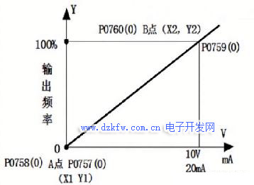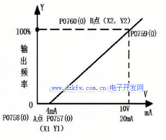 若设置P0761(0)=0时,即设置死区宽度为0V,那么AI1端输入0~2V之间,输出频率为负值,即电机反转。