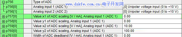 P0756(0)=0;AI2端选定0~10V电压输入。
