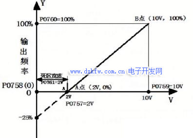 参见上图;若设置P0761(0)=2时,即设置死区宽度为2V,那么AI1端输入0~2V之间,输出频率都是0Hz。