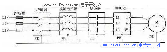 上图是一副变频器接线图。在变频器的安装中,有一些问题是需要注意的。例如变频器本身有较强的电磁干扰,会干扰一些设备的工作,因此我们可以在变频器的输出电缆上加上电缆套。又或变频器或控制柜内的控制线距离动力电缆至少100mm等等。
