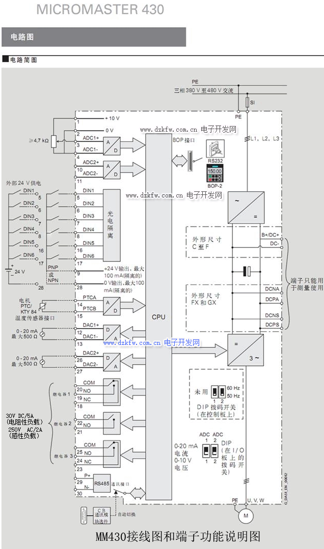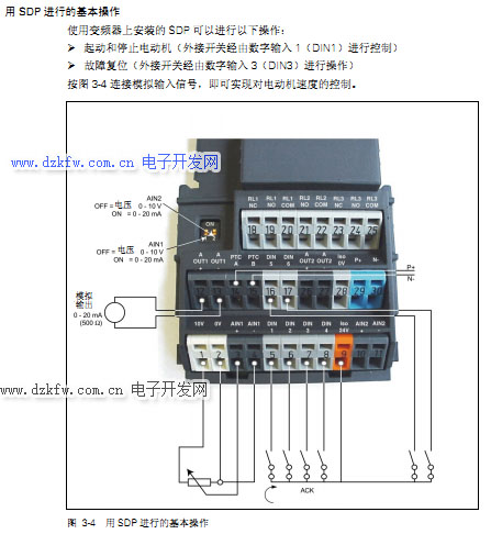 3、4端子为模拟量输入1,3正、4负,可连接电压信号(例如0~10V)或电流信号(0~20mA或4~20mA),通过DIP1开关和参数选择