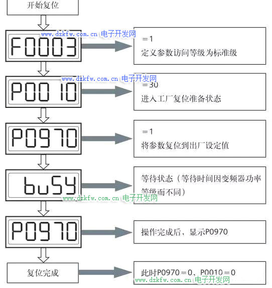 参数复位:参数复位,将变频器的参数恢复到出厂时的参数默认值。在变频器初次调试,或者参数设置混乱时,需要执行该操作,以便于将变频器的参数值恢复到一个确定的默认状态。