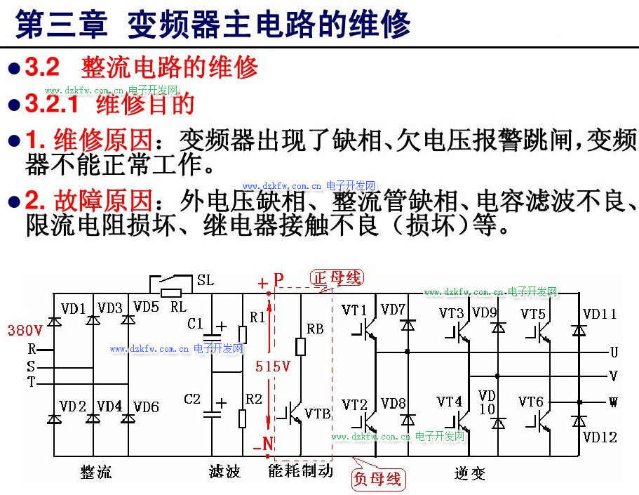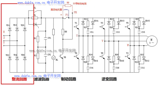 变频器主电路通常分为4部分:整流电路、滤波电路、制动电路和逆变电路。下面开始整体从左往右介绍各个回路。