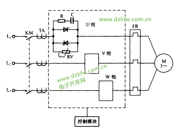 一方面其转矩近似与定子电压的平方成正比,另一方面电动机的电流又和定子电压成正比。电动机的起动转矩和初始电流的限制可以通过定子电压的控制来实现,而定子电压又是通过可控硅的导通相角来控制的。