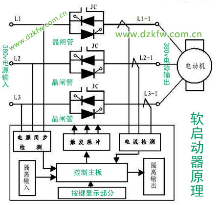 软起动主要由串接于电源与被控电动机之间三对反并联晶闸管调压电路构成。现代软启动器基本上都采用了电力电子技术和微机控制技术,以单片微机作为中央控制器控制核心来完成测量及各种控制算法。