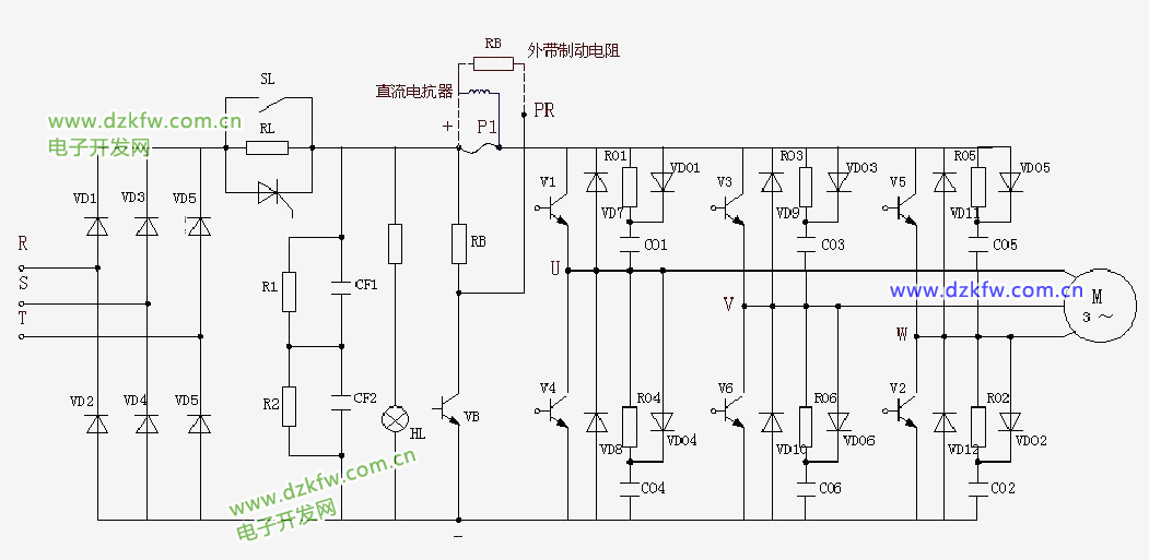 接着,直流电压加在了大功率晶体管VB的集电极与发射极之间,VB的导通由控制电路控制,VB上还串联了变频器的制动电阻RB,组成了变频器制动回路。我们知道,