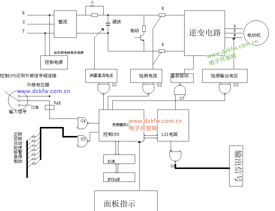 上图就是变频器控制电路的原理示意图。上半部为主电路,下半部为控制电路。主要由控制核心CPU 、输入信号、输出信号和面板操作指示信号、存储器、LSI 电路组成。