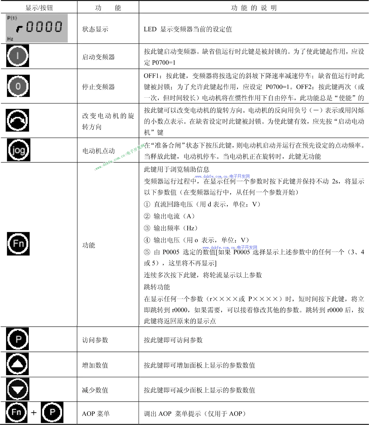 【关键点】 一般的用户,将变频器设置成标准级或者扩展级即可。BOP基本操作面板的外形如图4-3所示,利用基本操作面板可以改变变频器的参数。BOP具有7段显示的5位数字,可以显示参数的序号和数值、报警和故障信息以及设定值和实际值。参数的信息不能用BOP存储。BOP基本操作面板上的按钮功能见表2-3。