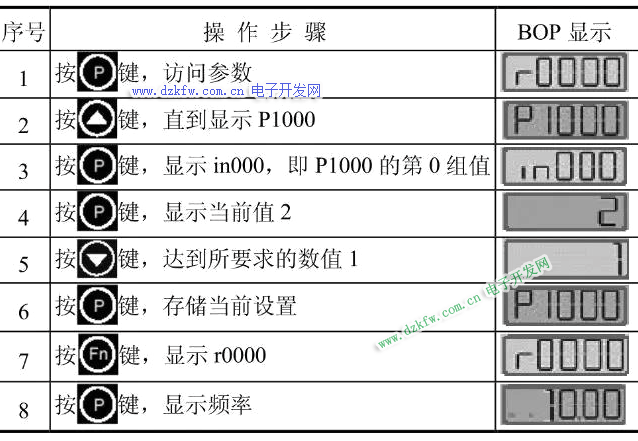 举例:将参数P1000的第0组参数(P1000[0]),设置为1。解:参数的设定方法见表2-3。