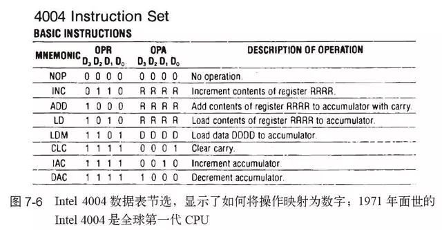 图7-6 取自Intel 4004 操作手册,显示了部分CPU 指令映射为数字的方法。随着制造工艺的发展,CPU 支持的操作越来越多。现代CPU 的指令集极为庞大,但最重要的指令在几十年前就已存在。