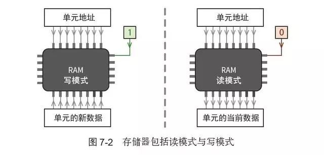 对于某个给定的单元地址,存储器可以进行两种操作:获取其值或存储新值,如图7-2 所示。存储器包括一条用于设置操作模式的特殊信号线。