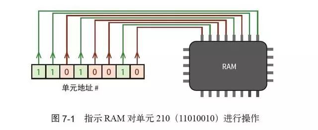 设置为“写”模式时,存储器从数据传输线获取一个字节,并将其写入相应的单元,如图7-4 所示。