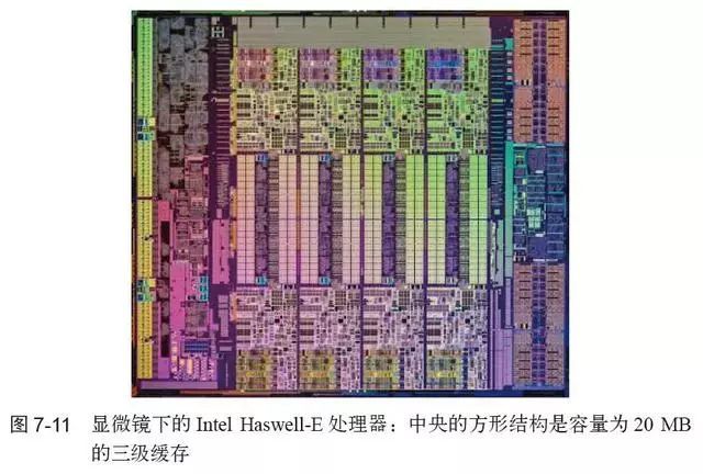 目前,不少制造商推出了配备三级缓存的处理器。三级缓存的容量比二级缓存大,虽然速度不及二级缓存,但仍然比RAM 快得多。一级/ 二级/ 三级缓存非常重要,它们占据了CPU 芯片内部的大部分硅片空间。见图7-11。