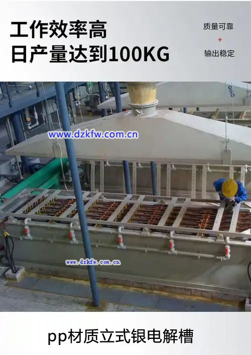 ③银电解槽。目前国内多用立式电极电解槽。它用硬质聚氯乙烯焊成,槽内用未接槽底的隔板横向隔成若干小槽,小槽底部连通,电解液可循环流动。槽底连通处设有涤纶布制成的带式运输机,专供运出槽内银粉,槽面设有带玻璃棒的机械搅动装置,可定期开动,防止阴阳极短路,又可搅动电解液。