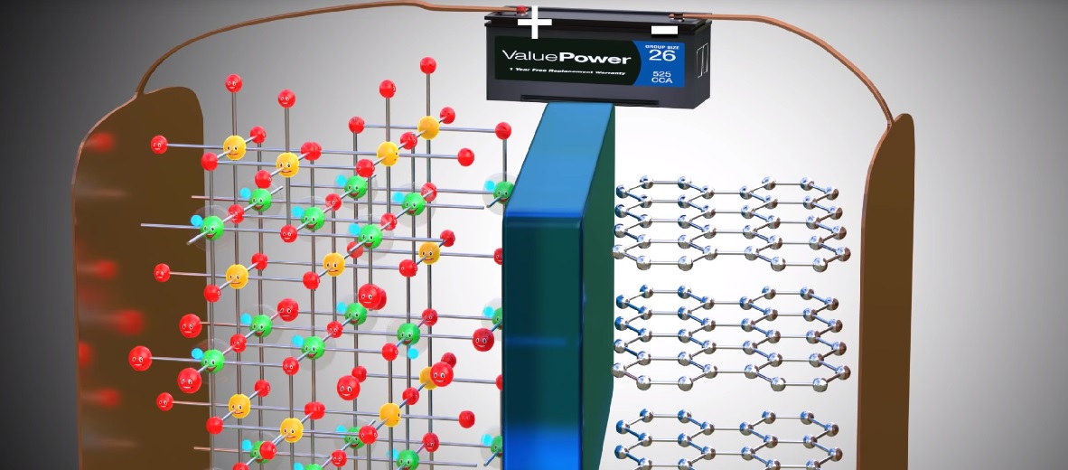 一旦给电池充电,电子就会随着外部导线在外部电源的作用下移动到负级,并储存在负级材料中,锂离子也会透过隔膜被吸引到负级材料中储存,此时电池处于高势能状态(也就是带电状态)。负级材料由石墨制成,由于石墨具有蓬松的孔状结构,所以能够束缚电子。负级发生的并非化学反应,而是物理反应,锂离子和电子并没有在负级形成化合物,而是通过物理手段把他们束缚住,从而产生电势能。