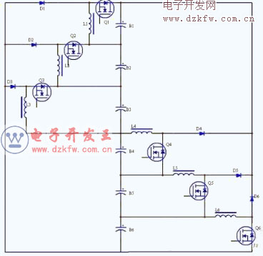 如果电池 B5 电压过高,控制 Q5 以 PWM 模式工作,当 Q5 开通,电感 L5 储能;当 Q5 关闭,电感储存的能量就会通过 D5 给电池 B1-B4 充电,降低 B5 电池电压抬高其余电池电压,利用同样的原理可以分析其余电池组电压过高时候的工作过程。