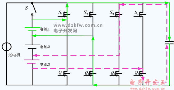 控制原理如下:设电池组内 B4 电压最高,B2 电压最低,控制继电器 S5、S3、Q4、Q2 闭合,此时两节单体电池并联,两单体电池自动均衡,电压趋于一致。该拓扑的缺点是充电过程中不能进行均衡,只能静置去极化时候进行并联均衡。