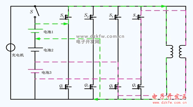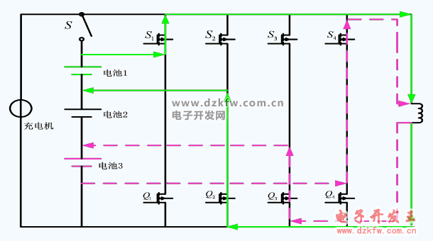 充电过程中,开关管 S 闭合,充电机给电池组充电。此时电池组右侧开关管全部断开,均衡系统不开启。设单体电池B1 电压开始明显高于其他电池并达到均衡阈值时,此时均衡系统开启,S1、Q2开关管闭合,电感与单体电池 B1 并联,起到分流的作用,电感储存来自充电机与电池 B1 的能量;当 S1、Q2 开关管置 0,Q3、S4 开关管置 1 时,电感给充电过程的单体电池 B3 释放一定能量。