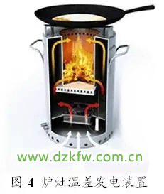 利用煤、油、天然气、木材等燃烧热以及取暖炉、烹饪炉等余热作为热源的温差发电装置可以作为便携式小型电源,为野外作业、游牧民族提供电源。其优点是可以利用来源广泛的热源发电,减少蓄电池携带量。此外,这种技术还可以用于制造旅行用便携式应急电源。国外已有可随身携带的小型温差发电器,利用燃烧热、宾馆取暖片等热源发电,用于为便携式电子设备(手机、笔记本电脑等)充电。图4是安装在普通炉灶底部的温差发电装置,利用炉膛底部废热发电,已在欧洲应用。主要为外出郊游、旅游者提供辅助电力