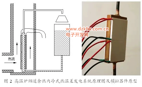 高温工业窑炉余热发电。主要利用钢铁、有色金属、玻璃、水泥、陶瓷等耗能工业窑炉以及发电厂等锅炉排放的150~250°C低品位余热发电。这部分低温余热难以采用常规技术发电,热电材料温差发电技术可以填补这方面的技术空白。图2是浙江大学赵新兵等人提出的利用高温炉烟道余热发电的内冷式温差发电系统原理图及模拟器件原型。它利用烟道余热和循环水冷片之间的温差(约100~150°C)发电,可模块化生产,现场组装。