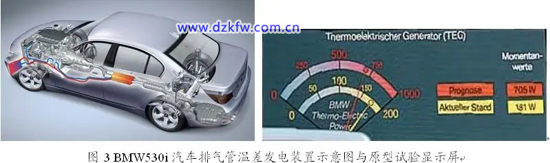 汽车发动机余热发电。美国通用汽车、日本丰田汽车已开始这方面的研发,德国宝马汽车已在530系列汽车上进行原型试验(图3)。据估算,一辆中高档轿车正常运行时,可利用排气管废热发电1千瓦(远期目标可达5千瓦或更高)。