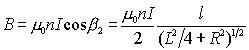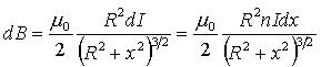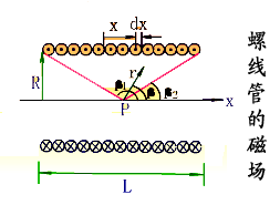 任取电流元 ,由毕-萨定律得: ,方向如图:将dB进行正交分解: 所以有: 所以: 所以: ,方向:沿x轴正方向,与电流成右螺旋关系。讨论:(1)圆心处的磁场:x=0 , (2)当 即P点远离圆环电流时,P点的磁感应强度为: 例3:设有一密绕直螺线管。半径为 R ,通电流 I。总长度L,总匝数N(单位长度绕有n 匝线圈),试求管内部轴线上一点 P 处的磁感应强度。 |