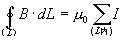 安培环路定理:磁感应强度沿任何闭合环路L的线积分,等于穿过这环路所有电流强度的代数和的μ0倍。用公式表示有: