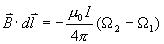 假设场点P沿闭合的安培环路L移动一周,则环路积分 将正比于立体角Ω在此过程中的总改变量ΔΩ。如果L不与L'套连,则ΔΩ=0,于是: