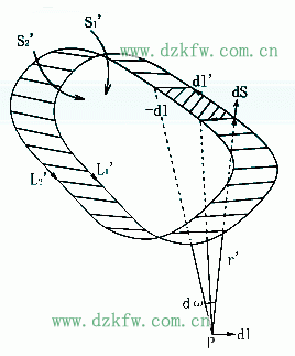 假设以L'为边界作一曲面S',S'对P点也张有一定的立体角Ω。当L'平移时,Ω随之改变。如上图L2'和L1'分别是L'沿-dl平移前后的新、旧位置,令S2'和S1'代表S'的相应位置,Ω2和Ω1代表相应的立体角。因S2'和S1'和带状面组成闭合曲面,它对于外边的P点所张的总立体角Ω2-Ω1+ω=0,所以: