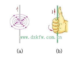 磁感线方向与电流的关系用安培定则判断:用右手握住通电直导体,让伸直的大拇指指向电流方向,那么,弯曲的四指所指的方向就是磁感线的环绕方向,如下图(b)所示。