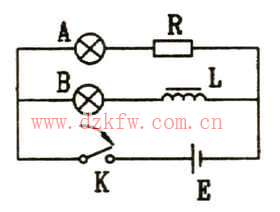 右图的电路中,A、B两灯泡规格相同,A与电阻R串联,B与带铁心的线圈L串联,R与L的电阻值相等,当和尚开关K后,可以看到电阻R串联的灯泡A立即正常发光,而与有铁心的线圈L串联的灯泡B却是逐渐亮起来,这便是自感现象的表现结果。因为,在接通电路的瞬间,电路中的电流是从零开始增大,穿过线圈L的磁通量也随着增加。