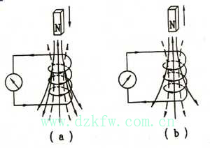 图中(b),表示磁铁从线圈内部拔出过程中,穿过线圈的磁通会减少(磁力线以实线表示)这时产生的感应电流,其磁通应阻碍线圈磁通的减少,所以感应电流磁场方向与磁铁的磁场方向相同。这样,感应电流的方向便可由右手螺旋定责来确定,即图(b)中箭头表示的方向。