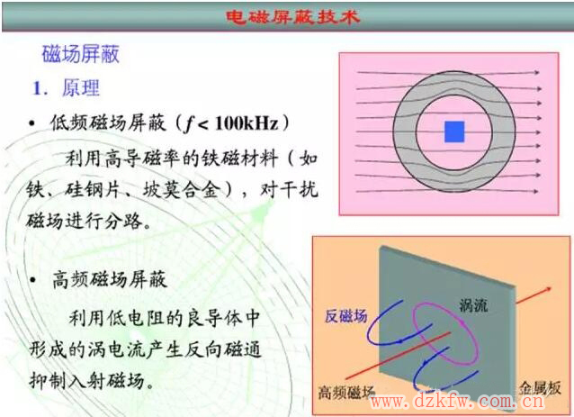 高电导率材料制成的屏蔽物对低频磁场的屏蔽效果比较差。例如,在工频50赫时,铜的贯穿深度约为9.4毫米,薄壁铜壳的屏蔽作用很小。在实际应用中,常采用静磁屏蔽措施来屏蔽低频磁场。电磁屏蔽物接地后也可以屏蔽静电干扰。电磁屏蔽物上不能随意开缝,因为电磁屏蔽还利用了涡电流的作用,若缝隙割断了涡电流的通路,屏蔽效果要降低。