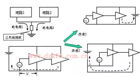 由于地线就是信号的回流线,因此当两个电路共用一段地线时,彼此也会相互影响。一个电路的地电位会受到另一个电路工作状态的影响,即一个电路的地电位受另一个电路的地电流的调制,另一个电路的信号就耦合进了前一个电路。