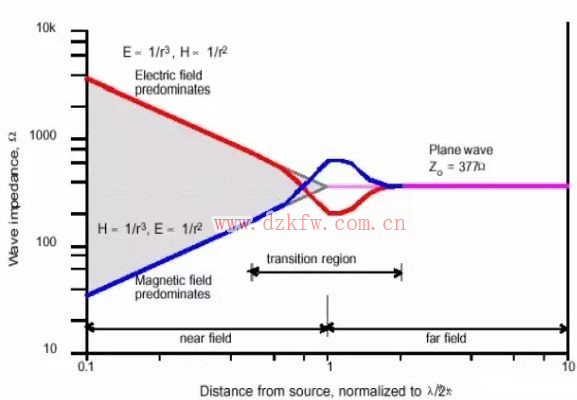 在远场区电场和磁场方向垂直并且都和传播方向垂直称为平面波,电场和磁场的比值为固定值,为 Zo=120∏=377 欧。下图为波阻抗与距离的关系。