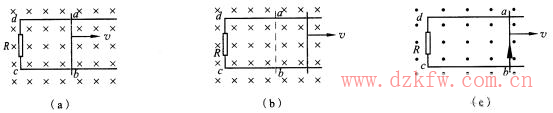 已知原磁场的方向垂直于纸面向内[图(a)];当ab边向右滑动时,穿过闭合电路abcd的磁通量增加[图(b)];根据楞次定律可知,线框abcd中产生的感应电流的磁场要阻碍该闭合电路中磁通量的增加,因此在矩形线框内感应电流的磁场方向应与原磁场方向相反,即垂直于纸面向外[图2-10(c)];运用安培定则可以判定,感应电流沿b→a→d→c方向流动时,才能激发出方向垂直于纸面向外的磁场,所以ab边中感应电流的方向应该是从b流向a。