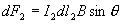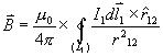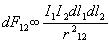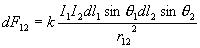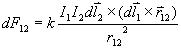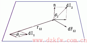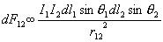 (2) dF12的大小还与两电流元的取向有关。为了叙述方便,令r12代表从电流元1到电流元2的矢径,电流元的线元也用矢量dI1和dI2来表示,它们指向各自的电流方向(如上图)。
