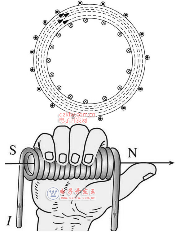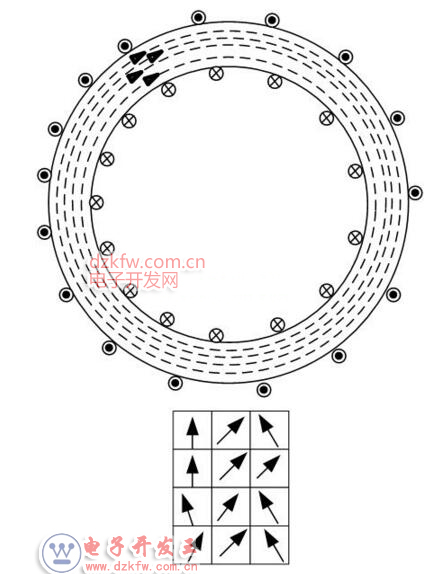 再次强调一下,我们之前提到的"规则磁"概念,开关电源无论变压器或者电感,磁路都是被磁性材料限制的一个闭合回路,以铁磁性材料做成的电感说明,磁通或磁力线被限制在低磁阻的磁芯中,这为我们用法拉第定律或安培环路定理的计算提供了诸多便利(前几节我们推导电感公式和气隙均用到安培环路定理),如下图是环形电感中磁力线(虚线)在磁芯中分布的示意图,其中圆圈"X"表示电流流进线圈,圆圈"·"表示电流流出线圈,磁力线方向用右手螺旋定则可以判断。