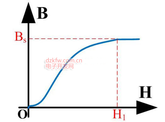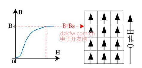 随着外加磁场H的进一步加强,铁磁材料的磁畴方向和外加磁场外加完全一致,铁磁材料达到最大磁通,出现"极限磁化"即磁芯饱和,这时候外加磁场进一步加强,但铁磁材料的磁通不会再增加,磁通密度达到最大值Bs。