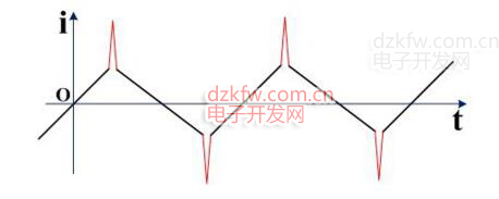 脉宽调制PWM情况下,变压器饱和导致的变压器励磁电流"i"出现非线性增长,如图红色"冒尖"即电流出现短路式增长。