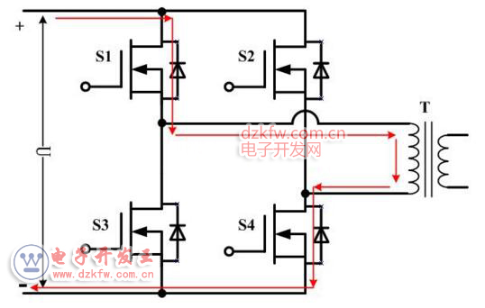 饱和举例:如下图是全桥拓扑,如"红线"路径,假如变压器饱和,那么母线"U"就会被短路,这时候如果没有保护措施或者保护响应时间不够,包括电路中的功率开关管、变压器线圈等会一并烧毁。
