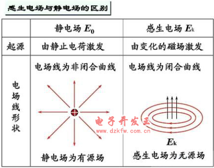 (4)电场对电荷做功不同:单位正电荷在静电场中沿闭合路径运动一周时、电场力做功为零,即静电力做功与路径无关;而单位正电荷在感生电场中沿闭合路径运动一周时,电场力所做的功不为零,即感生电场中的电场力做功与路径有关。